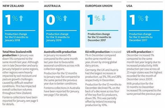 最近,恒天然(Fonterra)在其官網上披露了2018年2月最新財務數據,公司今年1月國內牛奶產量同比下降5%,原因是“糟糕的天氣狀況導致土壤濕度不夠,進一步影響了牧草生長和奶牛產奶”。